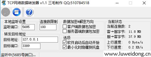 在网上找了个TCP网络端口转发器,监听端口填:5685,目标地址填:127.0.0.1,由于设置了服务器本地安全策略,监听只能填写127.0.0.1,改为服务器内网IP是不成功的。端口:3389.如图: