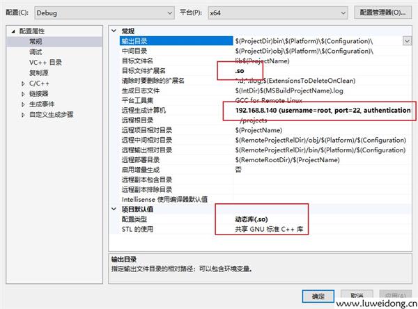 3、打开属性,设置目标文件扩展名:.so,配置类型:动态库(.so)以及远程生成计算机。