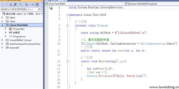 7、创建.net6控制台应用程序,测试调用.so文件,输入以下代码: