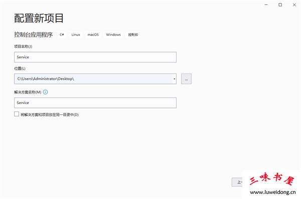 2、填写项目名称,我填写service,位置可选择桌面