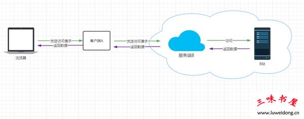 该代理软件包括客户端A、服务端B端,A运行于本机电脑中,B运行于远程阿里云服务器中。