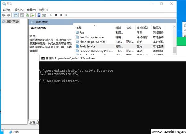 打开开始,运行,输入cmd,打开命令行界面,输入sc delete Fx Service