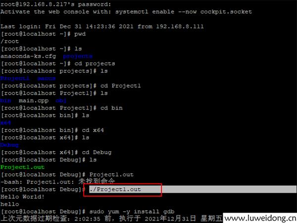 putty远程登陆至Liunx环境,cd命令至/root/projects/Project1/bin/X64/Debug,通过./Project1.out执行程序