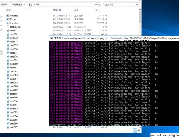 ffmpeg -i "rtsp://账号:密码@IP/mpeg4/ch1/sub/av_stream" -hls_flags delete_segments -hls_time 1 -hls_list_size 3 -vcodec copy -y C:\jky\hls\test.m3u8