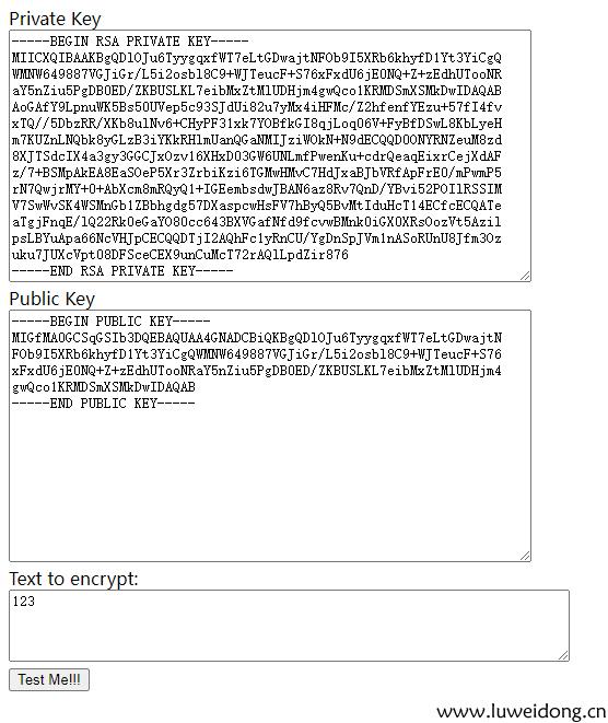 样例中有3个输入框,分别输入Private Key(私钥),Public Key(公钥),Text to encrypt(待加密文本)